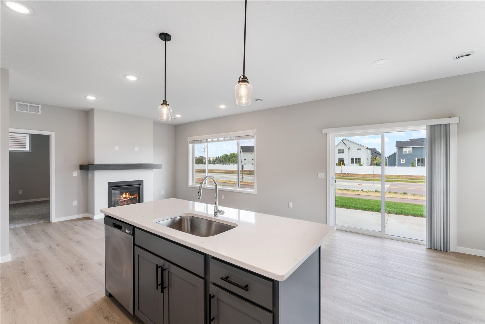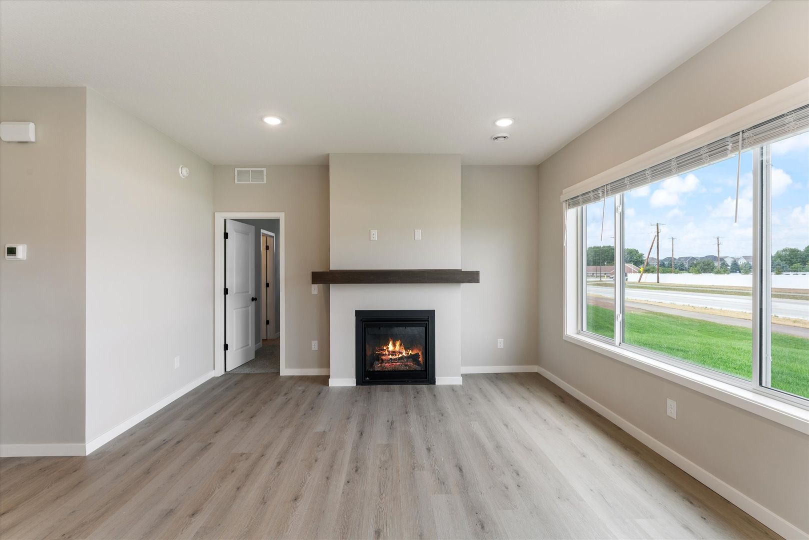 The living room's gas fireplace (with built-in decorative mantel) adds ambiance and coziness to the entire home.